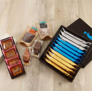 アーモンドマイスター11個入、ケイク・オ・マルコナ4個入、味付アーモンドキャラメリゼ、味付アーモンドトリュフソルト、アーモンドケーキプレーン、アーモンドケーキアールグレイ×各1個