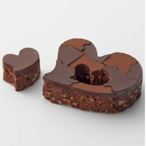 しっとり仕上げた生地にほろ苦いガナッシュ、パズルのように切り分けた生地はシェフの遊び心。マカダミアナッツやカシューナッツをふんだんに使い、ほろ苦くしっとり仕上げたチョコレートブラウニー。ハート型のパズルで遊び心を添えました。