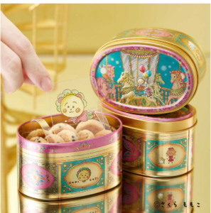 ピンクがアクセントになっているゴールドの楕円形の缶に、外側だけでなく中面にまで、さくらももこ先生の扉絵をデザインしました。缶の裏側には色鮮やかな植物に囲まれたコジコジを、底面にはピンク色を背景にしたコジコジをデザイン。どこもかしこもコジコジで、見ごたえ抜群の仕上がりです。