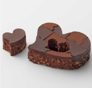 しっとり仕上げた生地にほろ苦いガナッシュ、パズルのように切り分けた生地はシェフの遊び心。マカダミアナッツやカシューナッツをふんだんに使い、ほろ苦くしっとり仕上げたチョコレートブラウニー。ハート型のパズルで遊び心を添えました。