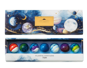 ギリシャ神話に登場するオリンポスの神々を司る惑星をイメージした半球体ショコラのアソート。様々な味のガナッシュやキャラメルソース入り。