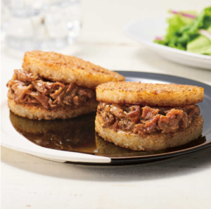 国産牛を特製のたれで焼きあげ、醤油と魚醤でうまみを加えたライスプレートでサンド。外はパリッと香ばしく、中はもっちりした食感です。