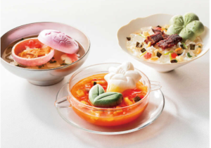 スープ(パンプキン・トマト・卵と野菜・気仙沼産ふかひれ×各1)、お吸物(はまぐり・鯛と柚子・伊勢志摩産あわびと聖護院かぶら×各1)、お茶漬(浜名湖産うなぎ蒲焼×2、牛肉そぼろ×各1)