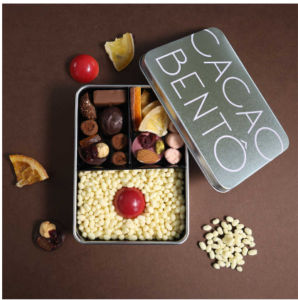 ライスパフにカカオ分35%のホワイトチョコレートを纏わせ、ボンボンショコラルージュを真ん中に置き、まるでごはんと梅干しのように見立てました。お弁当のおかずのように様々なチョコレートをギュッと詰め合わせたワクワク感のある“CACAO BENTO”。