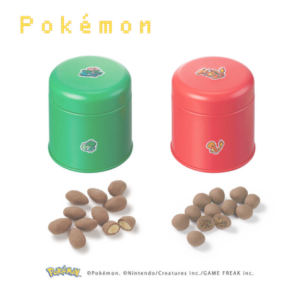 くさタイプ・ほのおタイプ缶:フシギダネ、ヒトカゲとその進化形を円柱缶にデザイン。アーモンドチョコレートといちじくのチョコレートを詰めました。