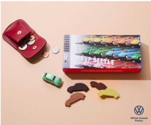 5つの味わいから1枚ずつピックアップして楽しめる、ビートルシルエットのプレート型チョコレート。ミニカーとお揃いカラーの、グリーンのチョコレートがポイント。