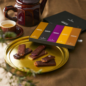 メゾン・ルルーの人気キャラメルを、上質なチョコレートで贅沢に包み込んだ華やかな5本セット。定番の塩バターキャラメル〈C.B.S.(R)〉をはじめ、ショコラ、カシス、オレンジジンジャー、タタンの5種を詰め合わせました。キャラメルの濃厚な甘みとチョコレートの深い香りが重なり合う、至福の味わいが魅力。ティータイムの贅沢なお供にはもちろん、上質なギフトにもぴったりです。フランス・ブルターニュが誇るキャラメル職人の技と、香り高いショコラの調和をご堪能ください。
